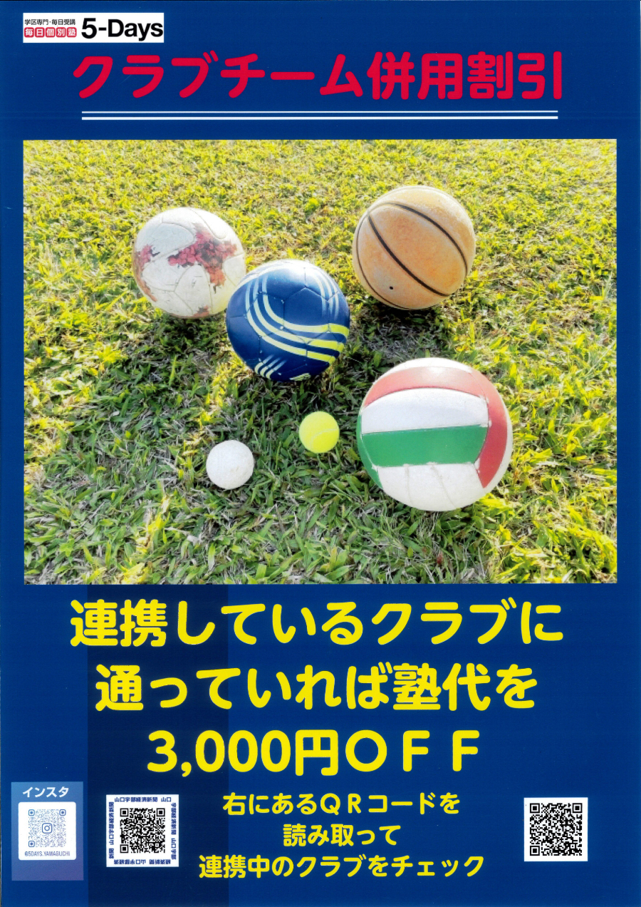 「5-Days」と連携しているスポーツクラブに所属する子どもさんは、月謝が3,000円引きになります。