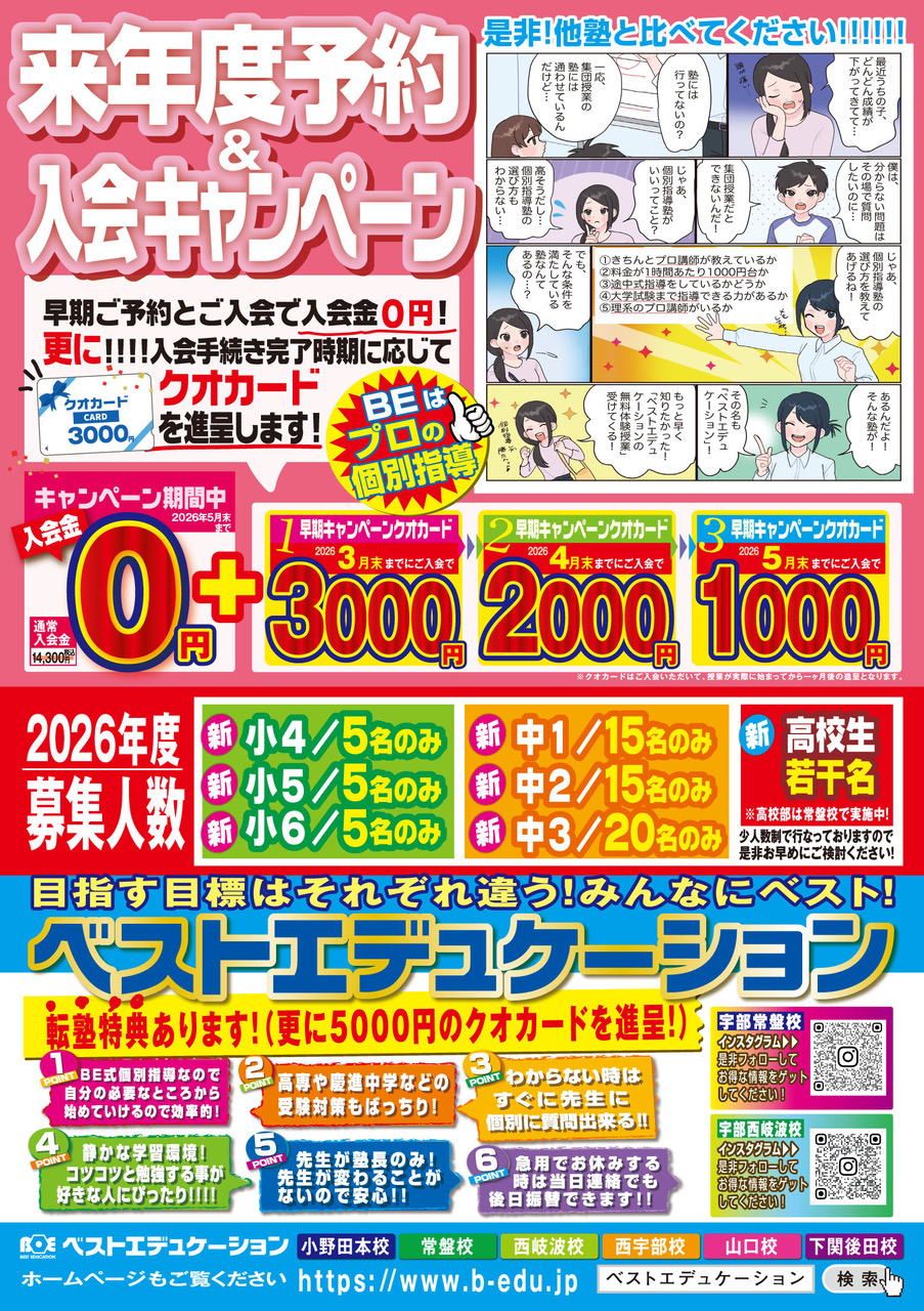 ときわ公園近くに開校したばかりの「宇部常盤校」など、県内6教室(山口・宇部エリアに5教室)を運営する個別指導塾「ベストエデュケーション」。全塾生は450人を超える「人気塾」です♪