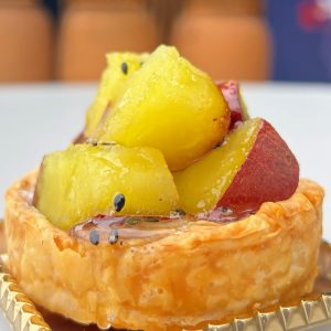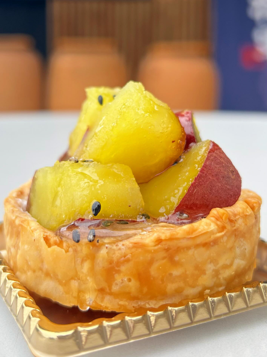タルト生地にクリームチーズとつぼ焼き芋を合わせ、最後にグレーズをかけて仕上げました。濃厚で甘い味わいと、クリームチーズのほんのりとした塩気がマッチ!