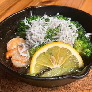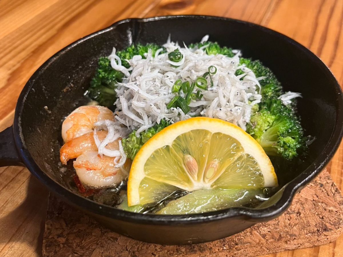 ◎「釜揚げしらす乗せ出汁巻きたまご」(800円)や「海老としらすのアヒージョ」(1,200円)、「出汁たけのこ炭焼き」(800円)など