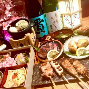 かぼすとろろ大根、味染みおでんたまご、鰆とチーズの春巻き、焼鳥四種、厚切り牛タン炭焼き、〆には明太バター焼きおにぎりや、春菊とカブのお吸い物。