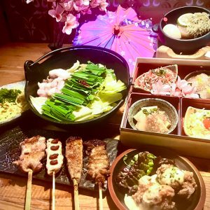 タケノコ土佐煮、炭焼きアスパラと鯛のお浸し、釜揚げしらすおろし、明太子とチーズのポテトサラダ、かぼすとろろ大根、味染みおでんたまご、長州鶏のチキン南蛮、焼鳥四種、国産もつ鍋、〆のラーメン