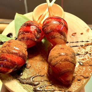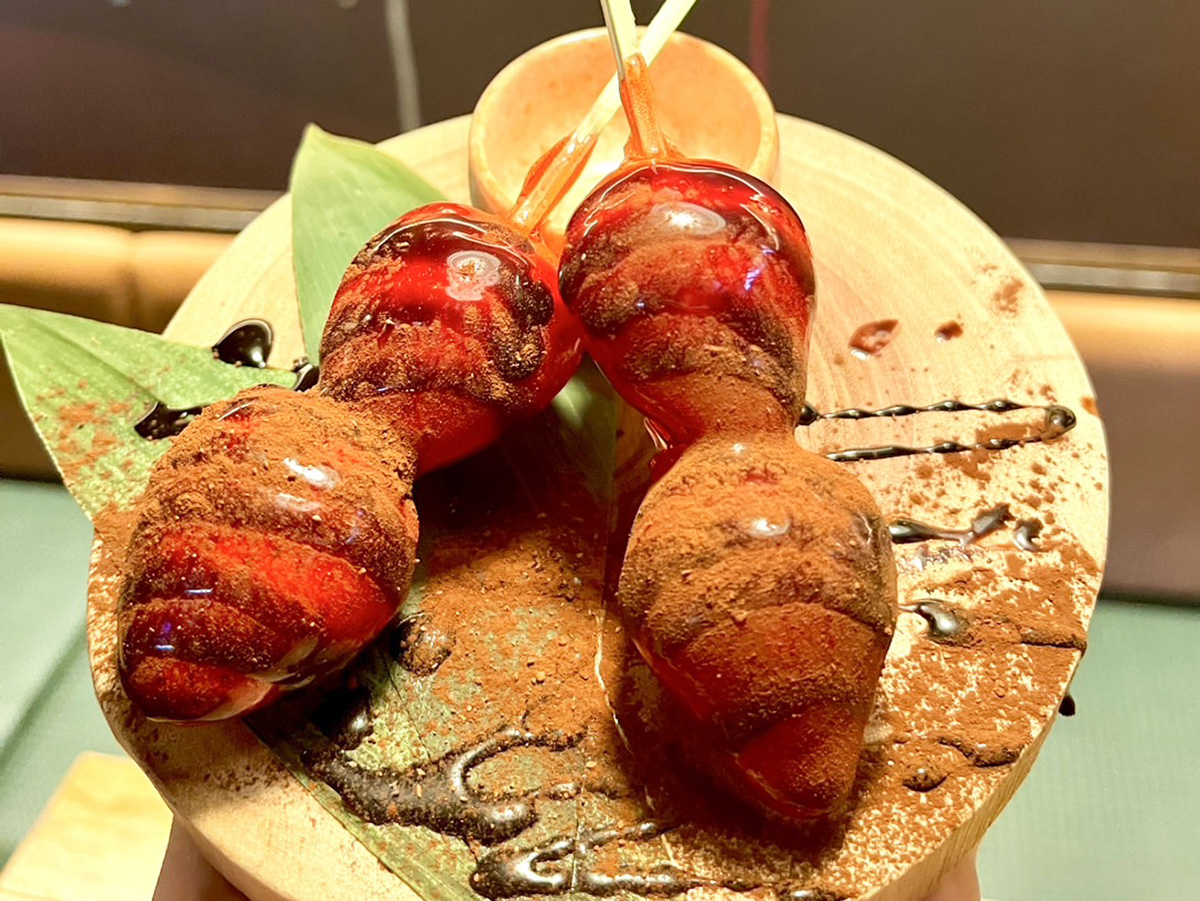 ・チョコソースをたっぷりかけた、今だけのフルーツ飴「ショコラいちご飴」(500円)