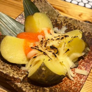 ほっくほくのじゃがバターの上に、明太子、とろ~りチーズ。熱々のうちにお召し上がりください♪