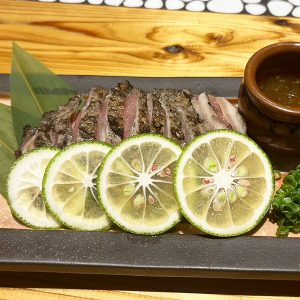 ◎さっぱりとした「かぼす塩だれ 地鶏たたき」(1,320円)