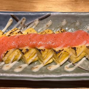地鶏のダシをたっぷり使った出汁巻きに、旨辛炙り明太マヨを乗せました。