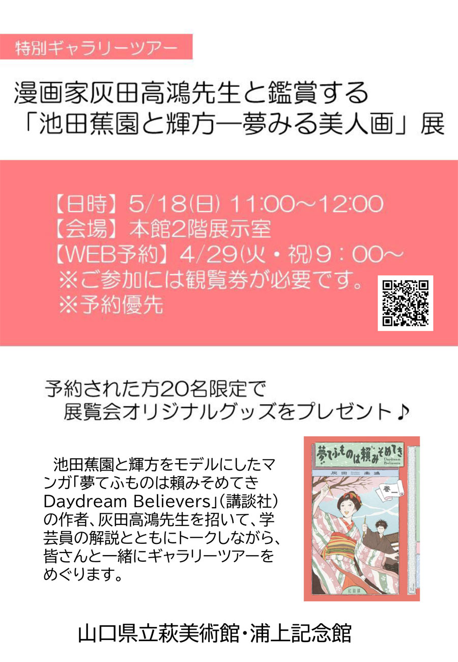 5月18日には、蕉園と輝方をモデルにした漫画の作者・灰田高鴻先生と学芸員のお話を聞きながら展示作品を鑑賞するツアーを実施します。