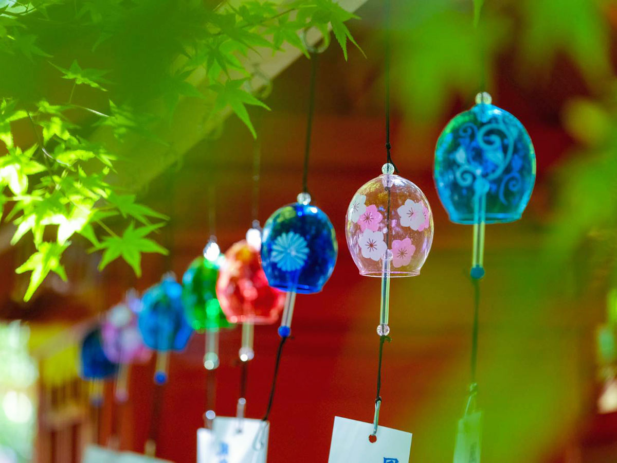 本殿周辺や手水舎など、境内各所をガラス風鈴がカラフルに彩ります。