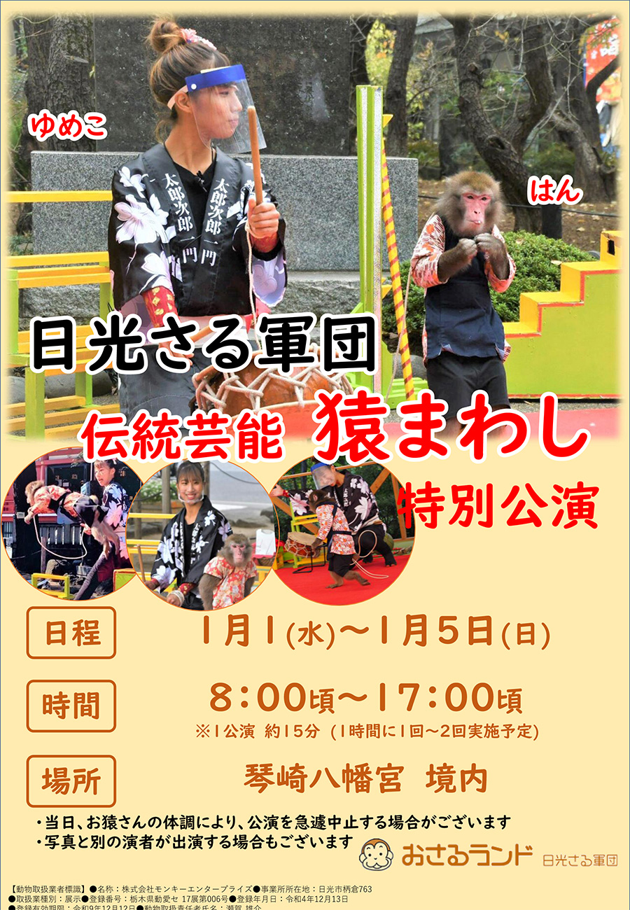 光市出身の猿まわし師・村崎太郎さん率いる本場の日光さる軍団がお正月にやってきます。
