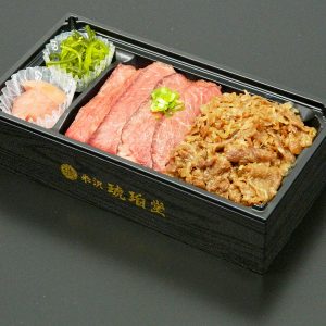 山形県が誇る銘柄牛「米沢牛」をステーキと甘辛いすき煮でお届けする贅沢なお弁当です。
