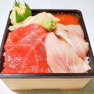 天然本マグロの赤身と炙りのブリが紅白に彩る豪快な海鮮弁当。