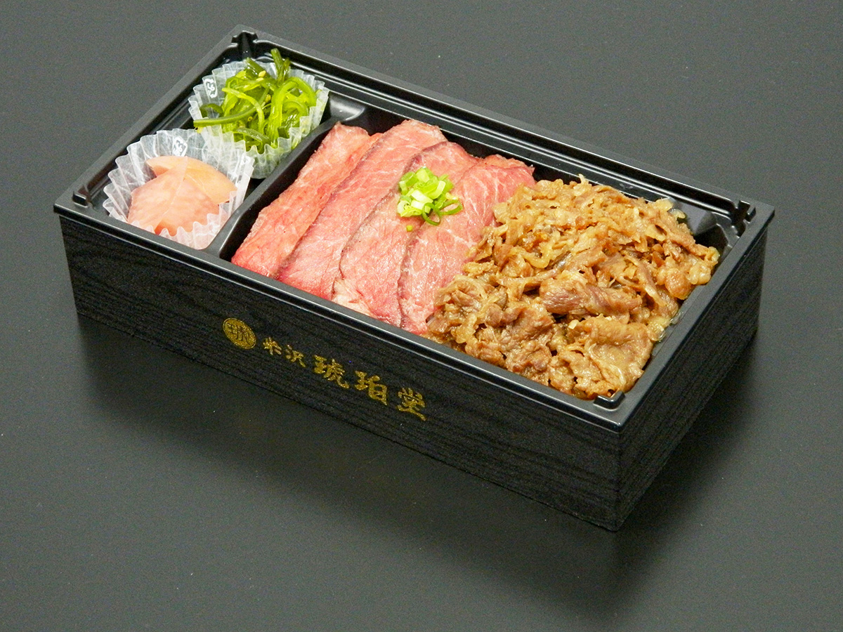山形県が誇る銘柄牛「米沢牛」をステーキと甘辛いすき煮でお届けする贅沢なお弁当です。