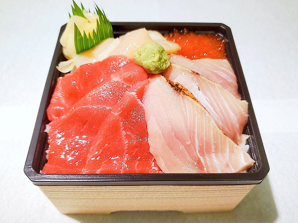 天然本マグロの赤身と炙りのブリが紅白に彩る豪快な海鮮弁当。