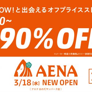 店舗数日本最大級のオフプライスストア「アエナ」が3月18日、おのだサンパークにオープンします!