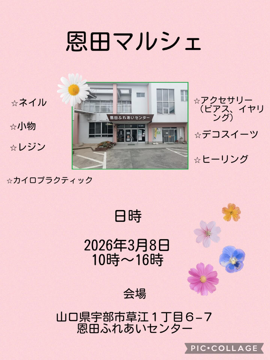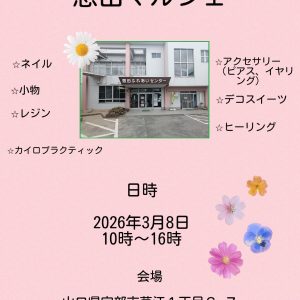 ハンドメイド雑貨、グルメ、占いやサロンなど、多彩なお店が出店する「恩田マルシェ」が3月8日、宇部・恩田ふれあいセンターで開催されます。